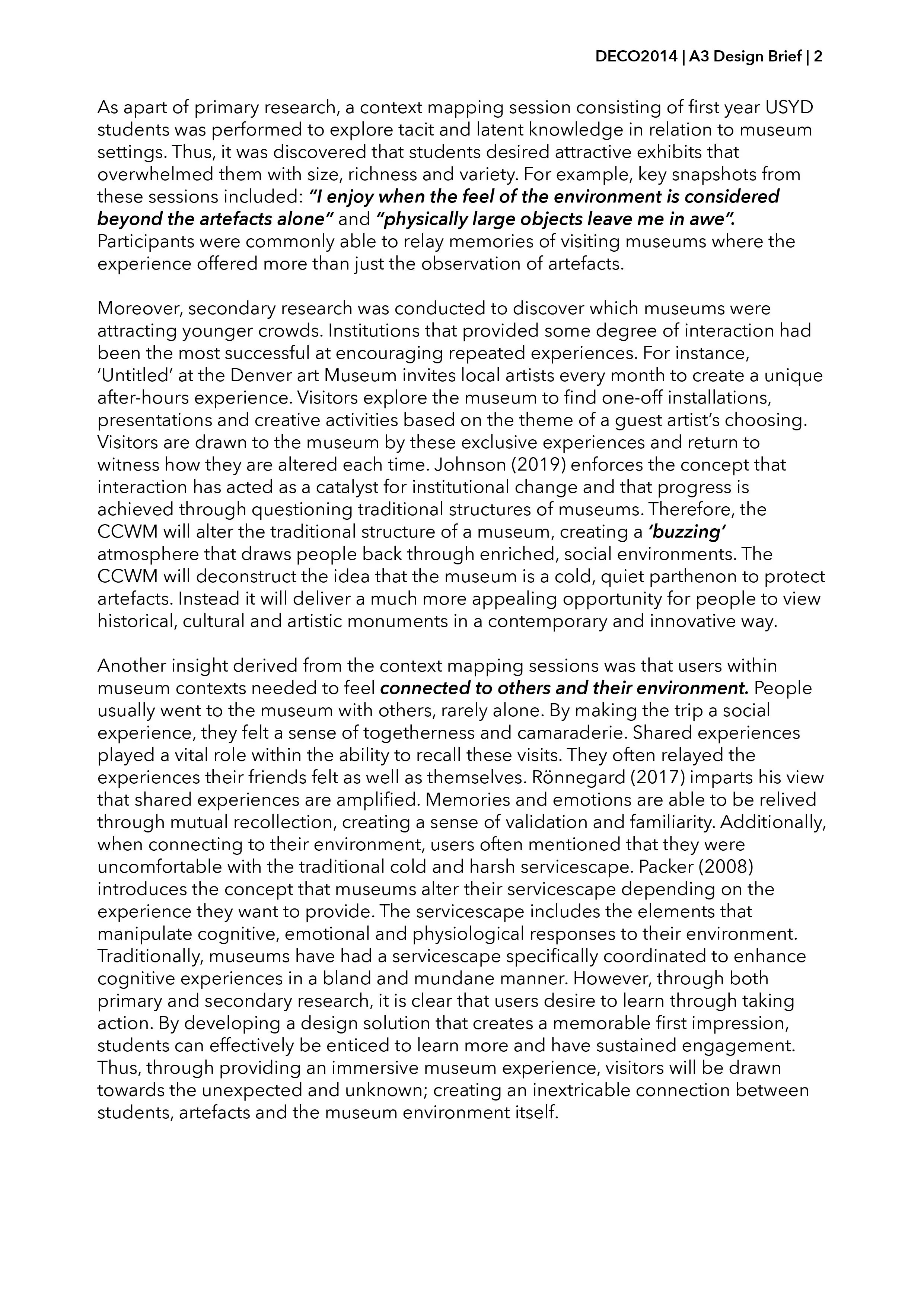 The initial brief for this project asked us to create a ‘serendipitous experience’ to future proof the Chau Chak Wing Museum. The process began by visiting the museum and attending a discussion panel. The information gathered during the panel was summarised to identify what the directors of the museum desired. We then gathered focus groups of first year USYD Students and conducted context mapping research sessions. From this we discovered the emotions and impressions towards museums (in general) and altered the brief accordingly.